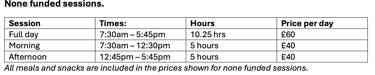 Please note, these fees are for children under school age. When your child starts full time school your session times and fees will change.
